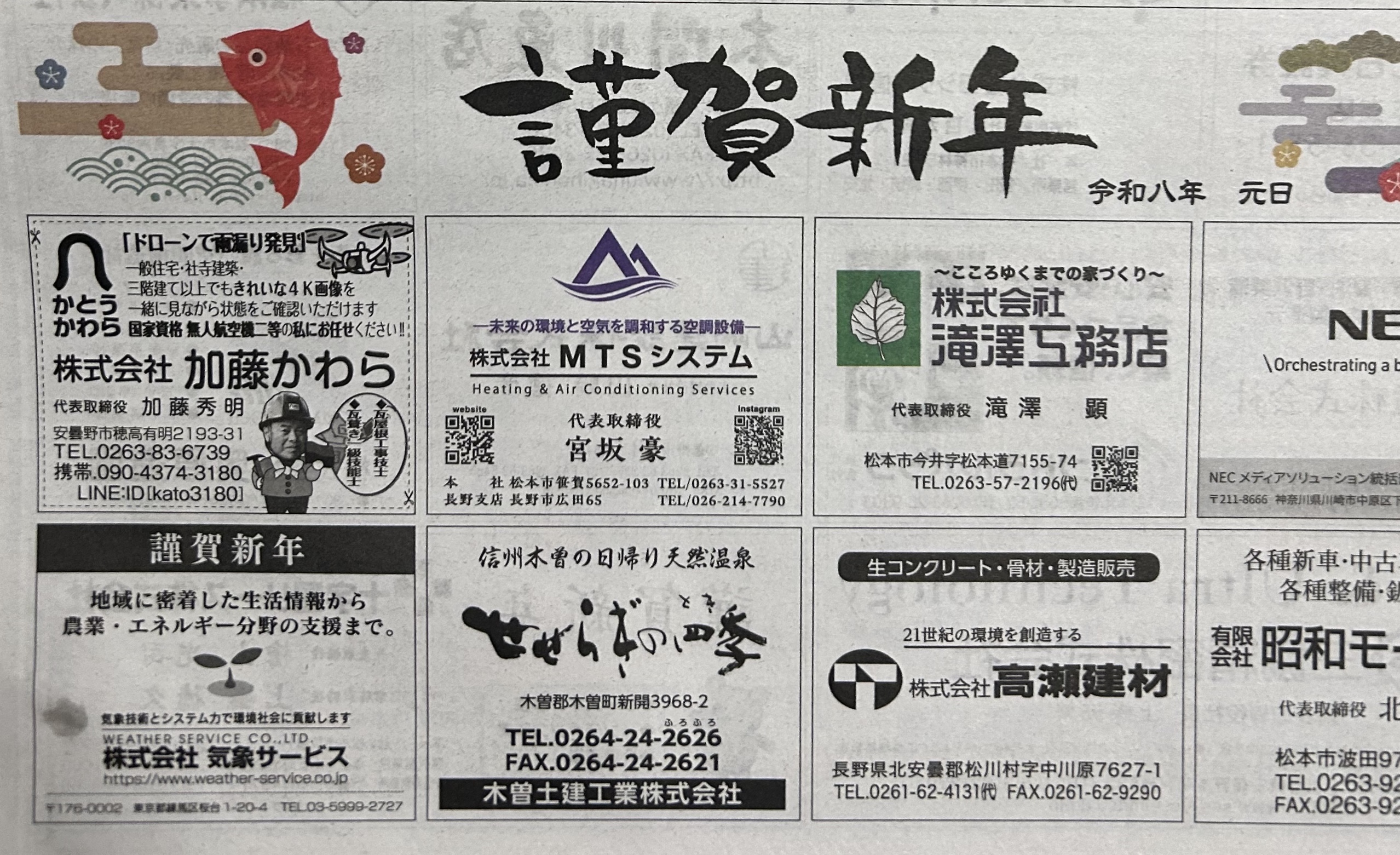 あけましておめでとうございます 2026 2/20 お知らせ 2026年1月1日2026年2月20日 本年も加藤かわらをどうぞよろしくお願いいたします。 毎年恒例の市民タイムスさん、ご覧いただけましたでしょうか? 2026年はドローンフル活用でお客様のお役に立てればと思っております! お知らせ よかったらシェアしてね! URLをコピーしました! URLをコピーしました! 瓦から立平葺きへ 宮大工さんからのご依頼 この記事を書いた人 yukifukushima 関連記事 年末年始休業日のお知らせ 2025年12月27日 ドローンの導入 2025年8月20日 夏期休業のお知らせ 2025年8月7日 瓦ショールームのご案内 2024年9月3日 防災の日 2024年9月1日 暑中見舞い申し上げます 2024年7月19日 トラックの納車 2024年6月14日 コメント コメントする コメントをキャンセルコメント ※ 名前 ※ メール ※ サイト 次回のコメントで使用するためブラウザーに自分の名前、メールアドレス、サイトを保存する。