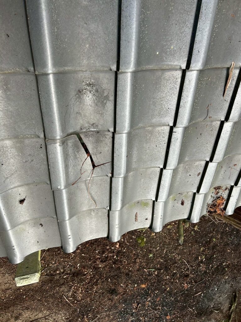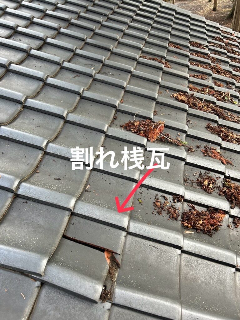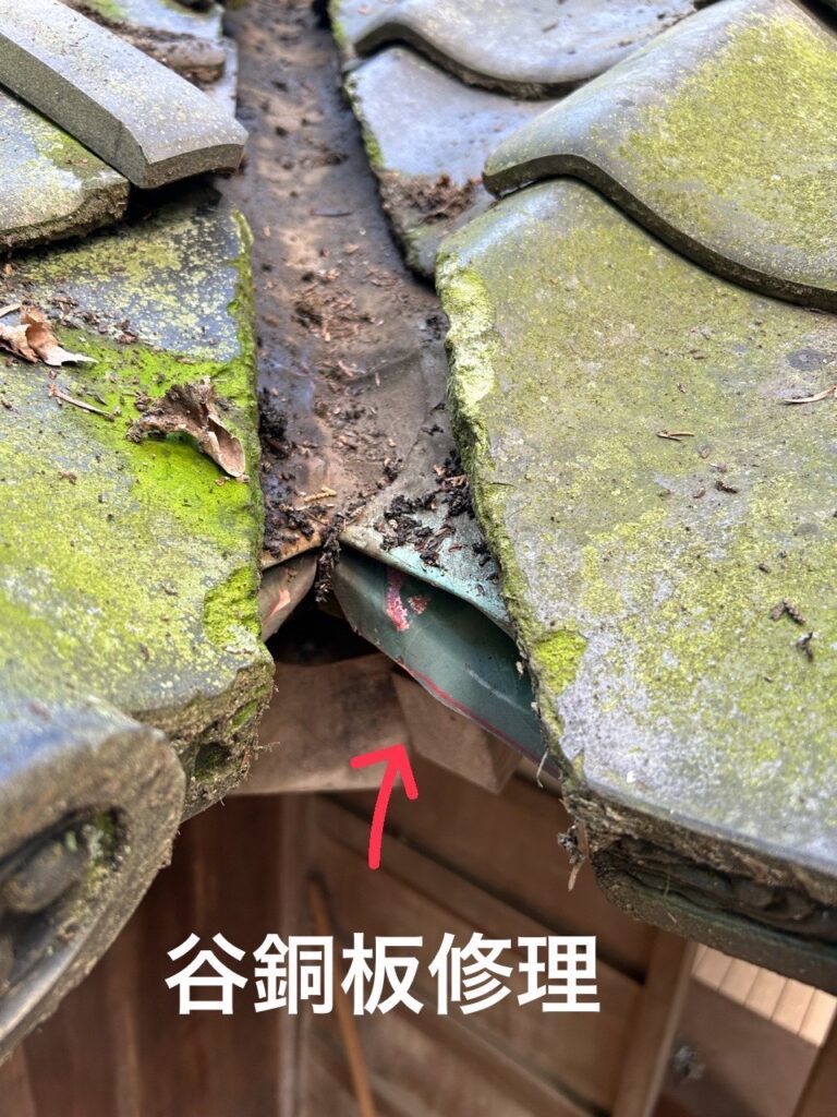 枝の落下が原因で神楽殿の瓦が2枚破損していましたのでそちらの交換と谷銅板の修理をしました。